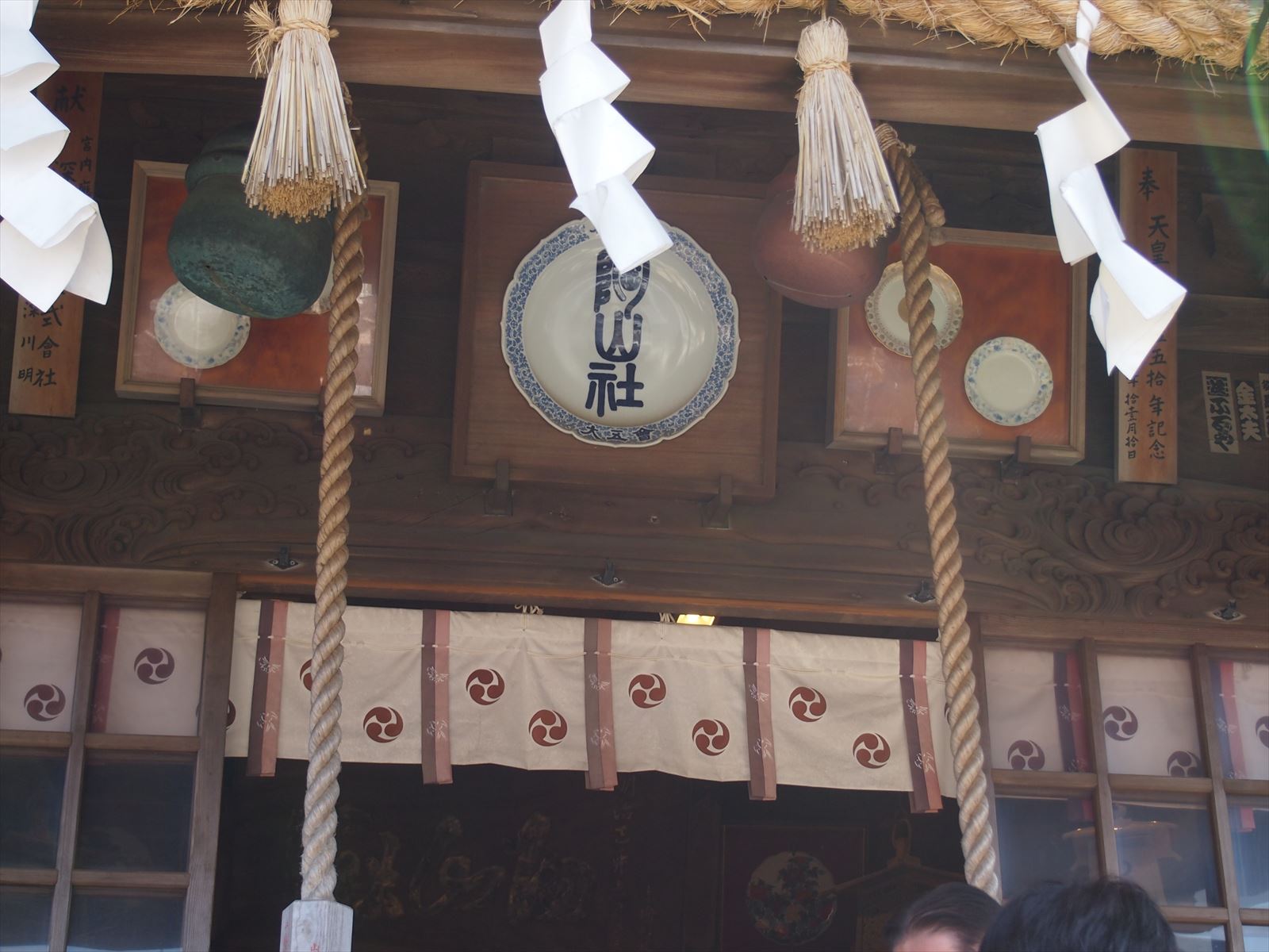 なかでも大鳥居は、平成12年4月28日に国の登録有形文化財に指定されており、年月がたち色あせてはきているものの染め付けの美しい唐草模様は非常に珍しく一見の価値があります。